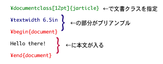 | ¥documentclass[12pt]{jarticle} ¥textwidth 6.5in ¥begin{document} Hello there! ¥end{document} |